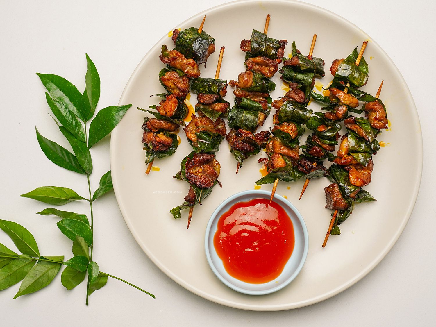 Thịt sau khi ướp thì xiên xen kẽ với lá mắc mật.