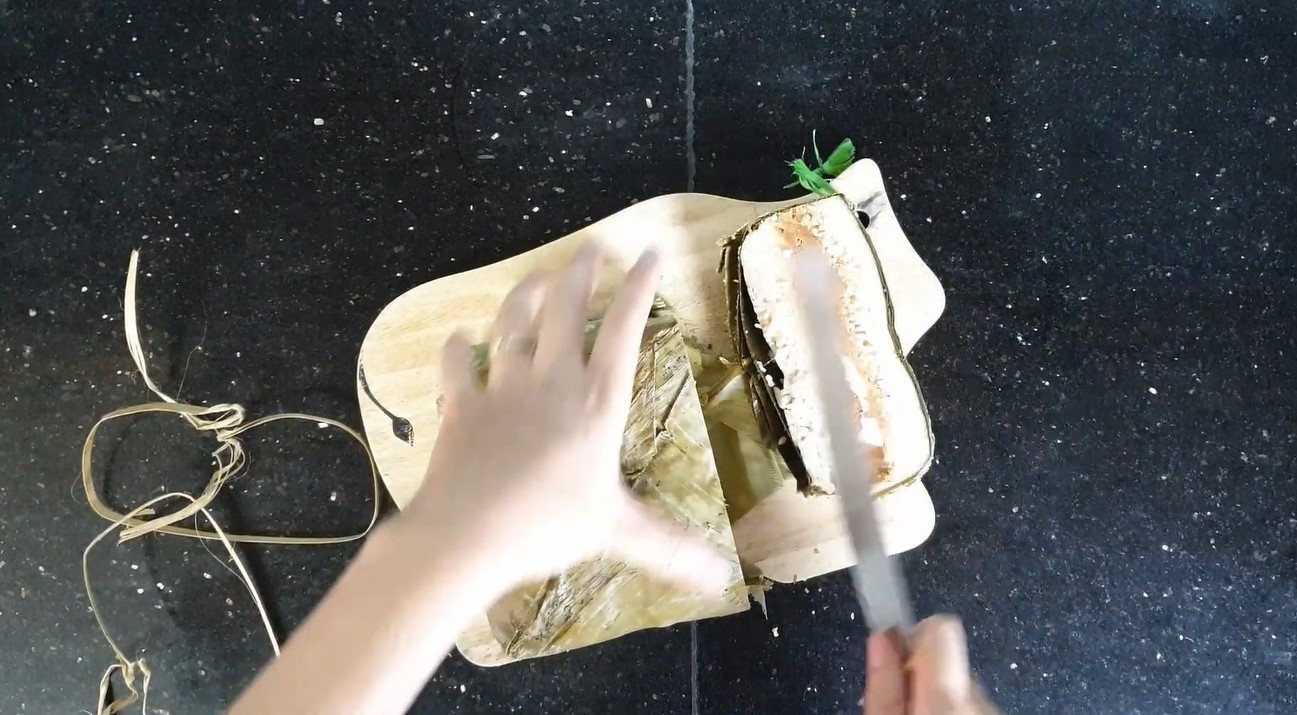 - Đầu tiên, bạn cần bóc lá bánh chưng. Trước hết, bạn tháo dây lạt, tước thành 6 sợi dây nhỏ.