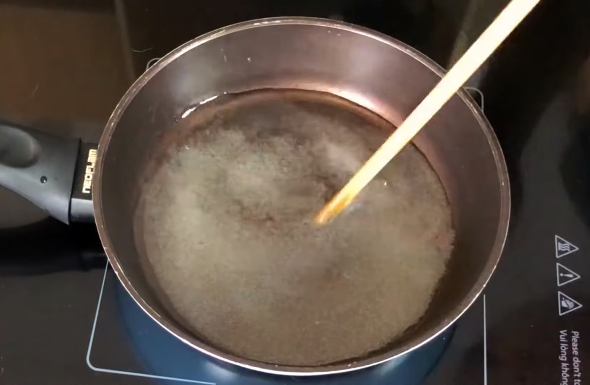 - Đầu tiên, bạn cho đường và nước vào nồi theo tỷ lệ 3:2 rồi đun nhỏ lửa. Lúc đầu, nước sẽ sôi rồi bay hơi bớt. Cuối cùng nước đường sẽ chuyển dần từ màu trắng ban đầu sang màu cánh gián.