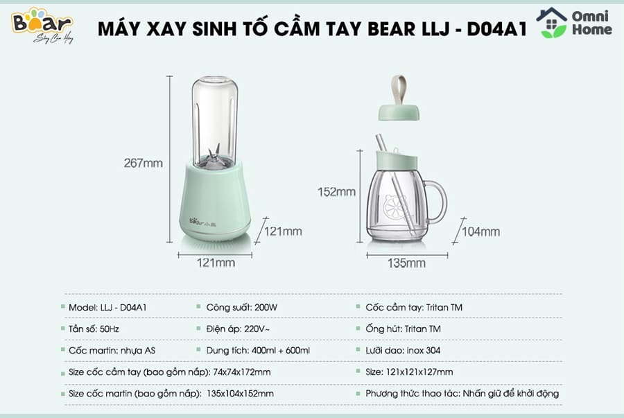 Thông số kỹ thuật Máy xay sinh tố hoa quả cầm tay Bear LLJ- D04A1