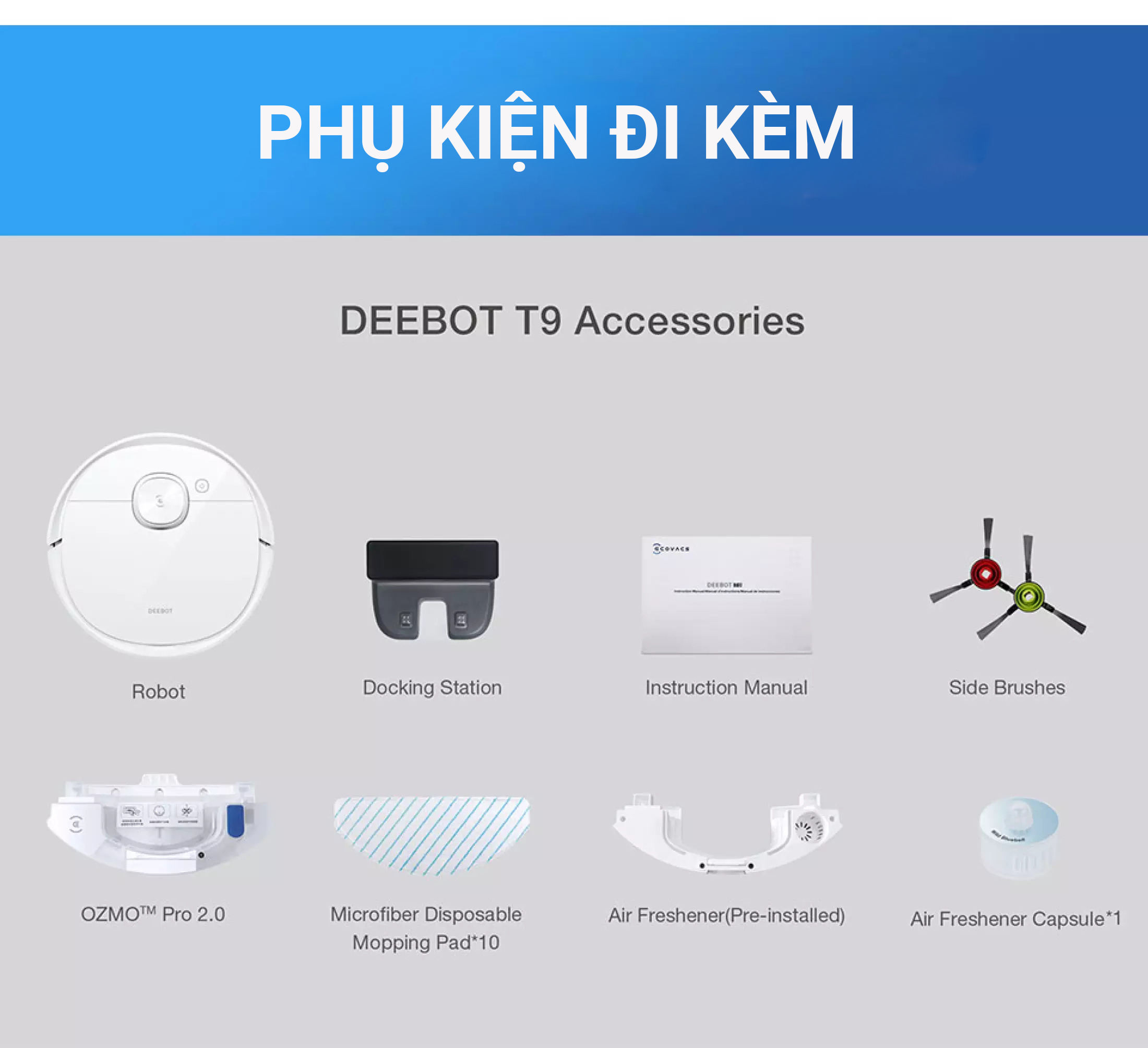 Ngoài 1 robot thì trong hộp đựng chúng ta còn có các phụ kiện như sau: 1 dock sạc, 2 chiếc khăn lau, 1 adapter nguồn, 1 bình chứa nước, 2 chổi hút, 2 chiếc khăn lau kèm theo, 1 lọc bụi và thiết bị điều khiển từ xa.