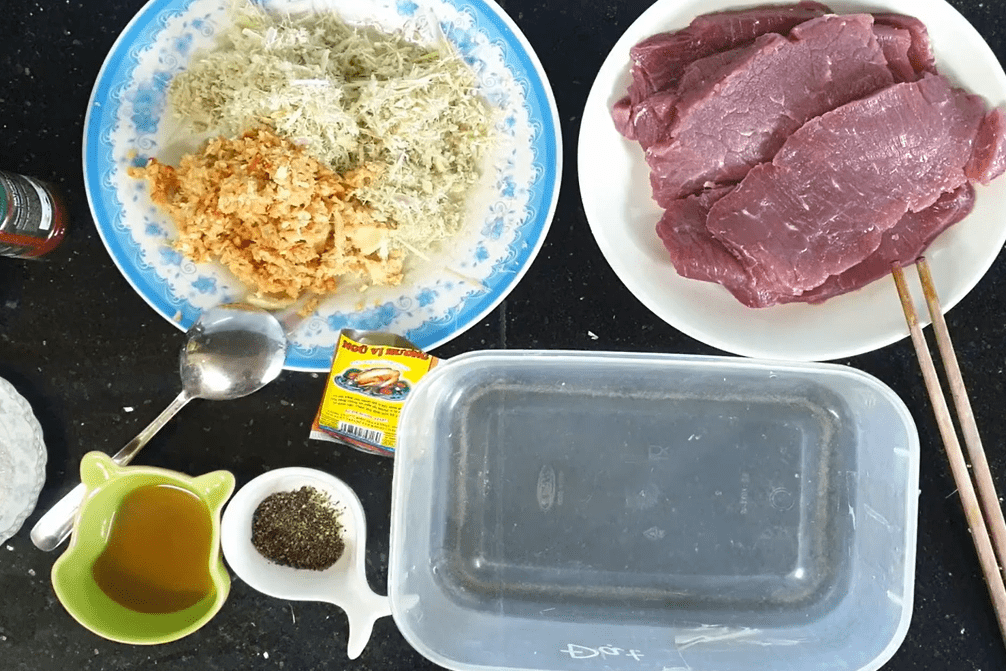 Sau khi đã vệ sinh thịt dải thì bạn cho thịt vào bát lớn, cho thêm 1/4 thìa cafe ngũ vị hương, 1 thìa cafe nước mắm, 1 thìa cafe dầu hào, và hỗn hợp tỏi, hành sả đã xay nhuyễn từ trước. Ướp thịt trong khoảng 1 giờ.