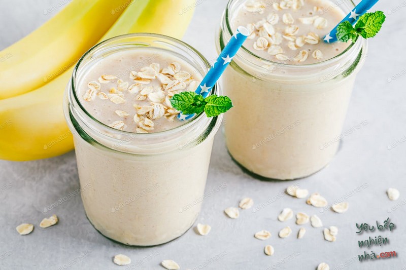 Xay nhuyễn hỗn hợp gồm sữa lúa mạch cùng với sữa chua, chuối cắt khúc, mật ong, quế