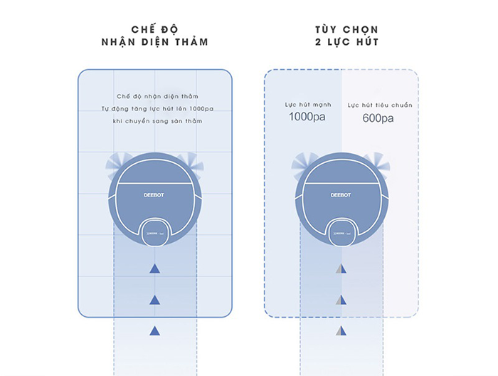 Với lực hút 700pa - max 1200pa, Robot hút bụi có thể làm sạch tất cả các loại bụi bẩn, lông thú, rác, tóc… một cách dễ dàng. Đây cũng là một đặc điểm nổi bật của Ecovacs Deebot DN58 khác với các dòng sản phẩm khác trên thị trường.