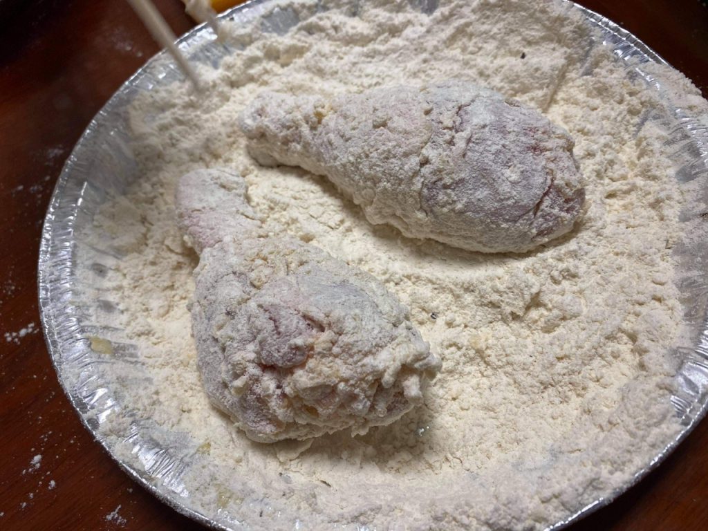 - Kế tiếp, bạn lại nhúng đùi gà vào bột ướt rồi lăn đùi gà vào bột xù là hoàn tất.