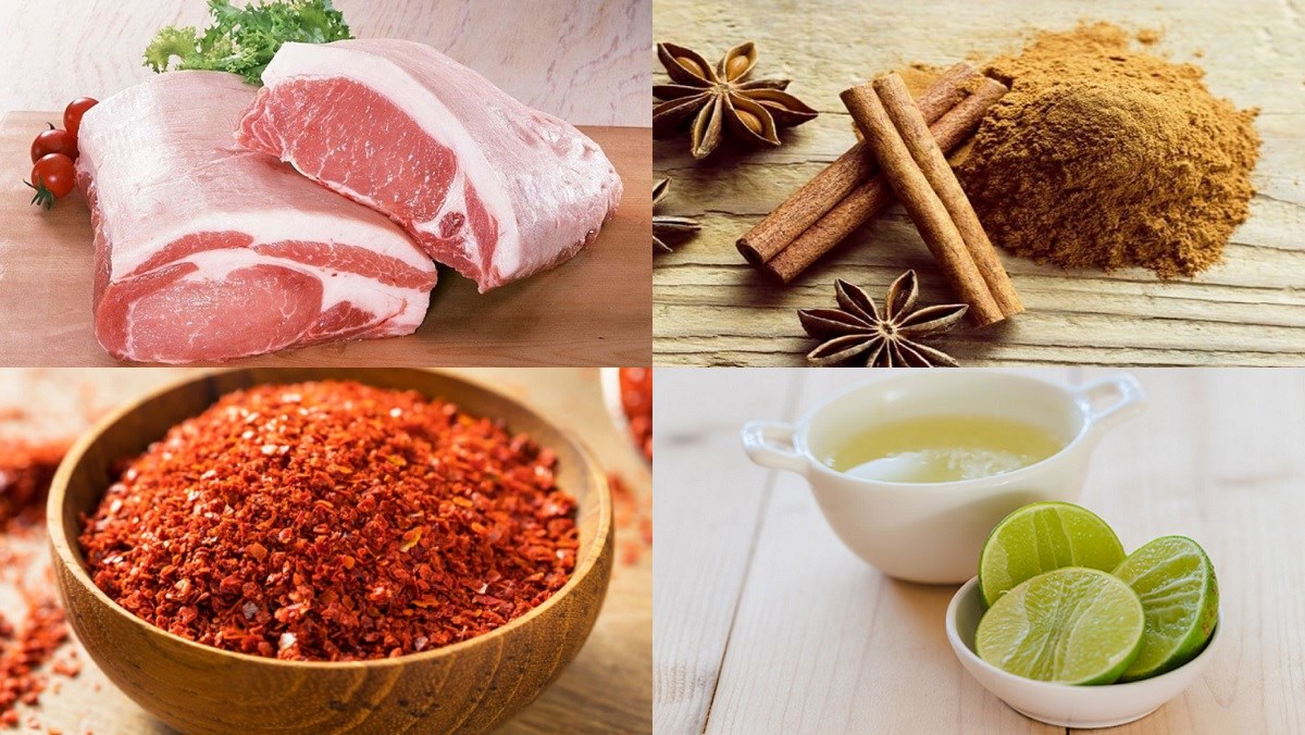 Chuẩn bị khẩu phần cho đủ 2 người ăn gồm: Thịt ba chỉ heo hoặc thịt đùi ( 500g), ớt bột hoặc ớt tươi xay nhuyễn ( 1 muỗng canh), bột ngũ vị hương ( 1 muỗng cà phê), nước cốt chanh ( 2 muỗng canh), gia vị khác ( đường, muối…)