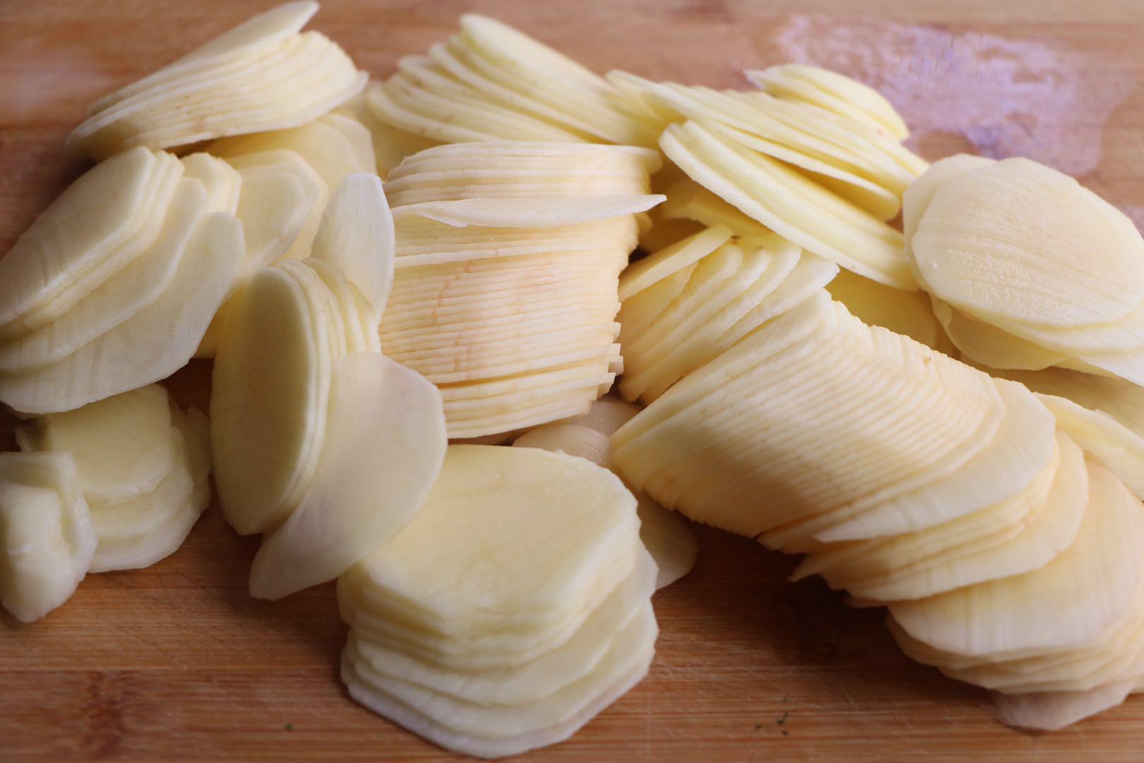 Bước 1: Gọt sạch vỏ và rửa sạch rồi cắt khoai tây thành các miếng mỏng hoach bạn có thể sử dụng dụng cụ bào mỏng.