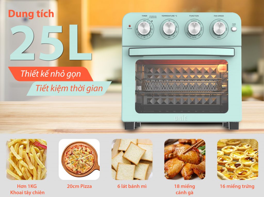 Lò nướng kiêm nồi chiên không dầu thế hệ mới UNIE Q37 có dung tích lớn lên đến 25 Lít. Đây được coi là mẫu nồi chiên có dung tích lớn nhất trên thị trường hiện nay. Với dung tích khủng, lò nướng sẽ giúp bạn chế biến dễ dàng nhiều khẩu phần ăn lớn cho các buổi liên hoan, gặp mặt bạn bè.