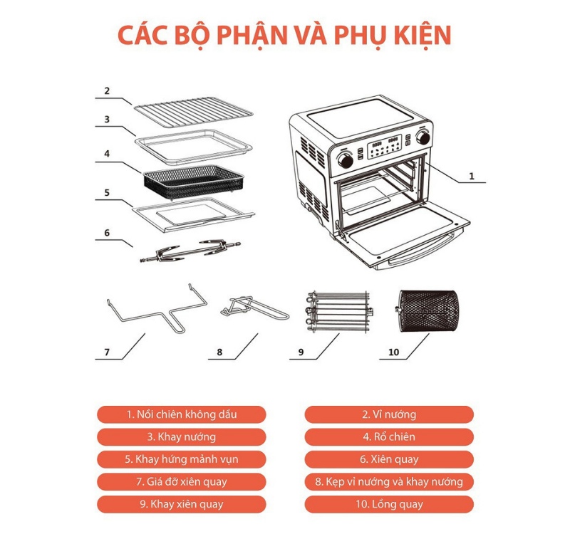 Nồi được trang bị đầy đủ tất cả các phụ kiện: Xiên quay, nhông quay, giỏ/ lồng quay, vỉ nướng, dụng cụ lấy đồ, khay nướng, rổ chiên, khay hứng đồ/ dầu ăn, kẹp vỉ nướng và khay nướng.