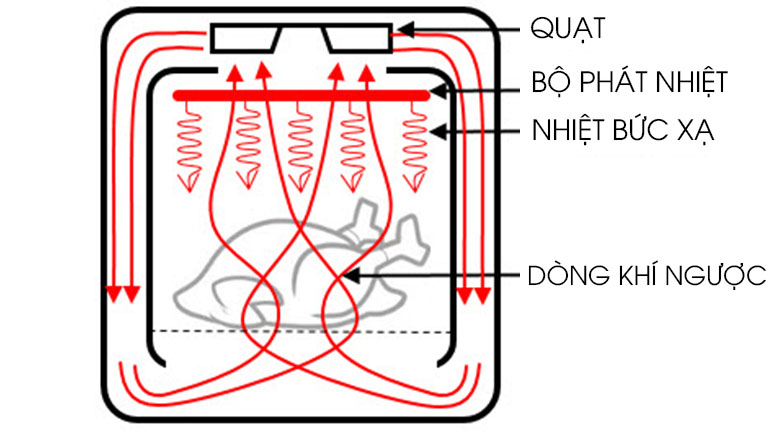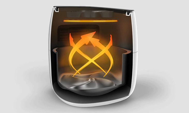 Còn với nồi chiên không dầu thì lại khác. Thay vì sử dụng dầu ăn, nồi chiên sẽ tạo ra lượng nhiệt cực lớn trong lòng nồi khiến thức ăn tự chín đều.