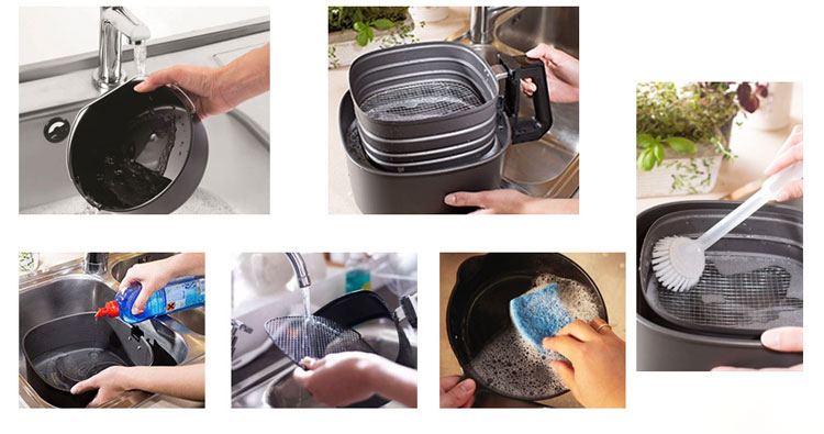 - Bước 4: Vệ sinh sạch sẽ nồi chiên, khay chiên, ngăn chứa dầu với nước rửa chén và nước sạch.