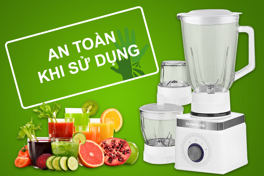 Điểm nổi bật ở máy xay sinh tố SUNHOUSE SHD5582W là có 3 cối xay chuyên dụng được làm bằng thủy tinh trong suốt bền đẹp và mức độ an toàn tuyệt đối.