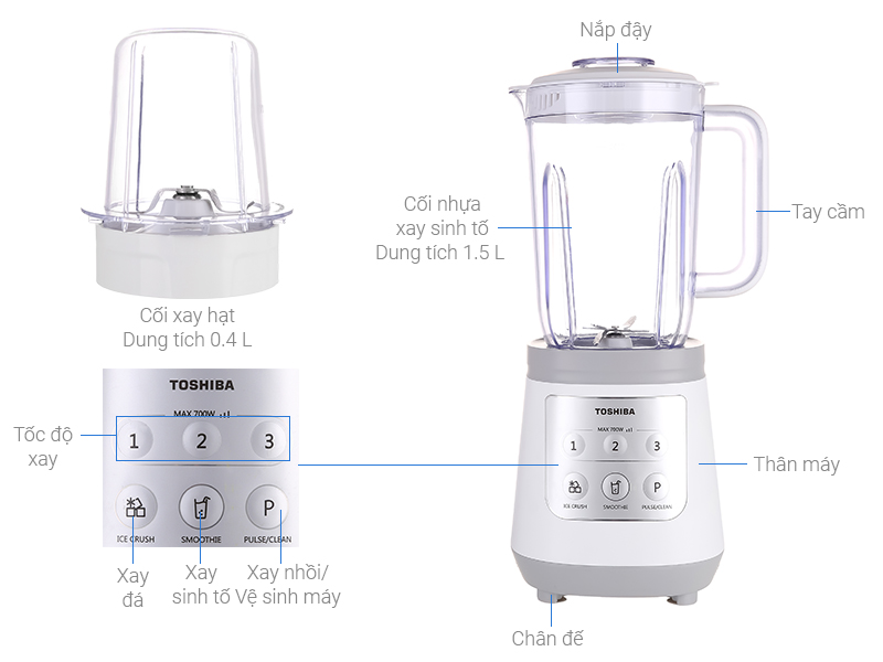 Máy xay sinh tố Toshiba BL-70PR1NV có cối lớn với dung tích lên đến 1.5 lít, một lần xay có thể xay từ 3 đến 4 ly sinh tố thơm ngon. Hơn nữa, máy còn được trang bị thêm một cối xay hạt nhỏ với dung tích 0.4 lít, thích hợp xay các loại hạt, tiêu, đậu, ớt, tỏi,...