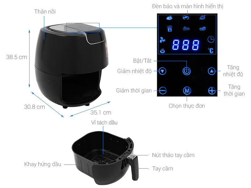 Nồi chiên không dầu làm chính thực phẩm bằng khí nóng nên hạn chế được tối đa lượng dầu mỡ thừa (lên đến 70-80%).