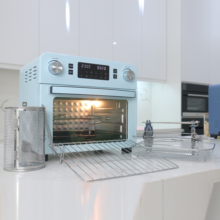Lò nướng kiêm nồi chiên không dầu làm chín thực phẩm mà không cần hoặc cần rất ít dầu ăn giúp đảm bảo sức khỏe, tiết kiệm chi phí cho gia đình.