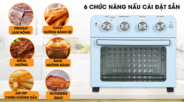 Lò nướng kiêm nồi chiên không dầu được tích hợp nhiều công nghệ hiện đại, các chức năng nấu có sẵn giúp bạn có thể chế biến được đa dạng món ăn khác nhau một cách nhanh chóng và dễ dàng.