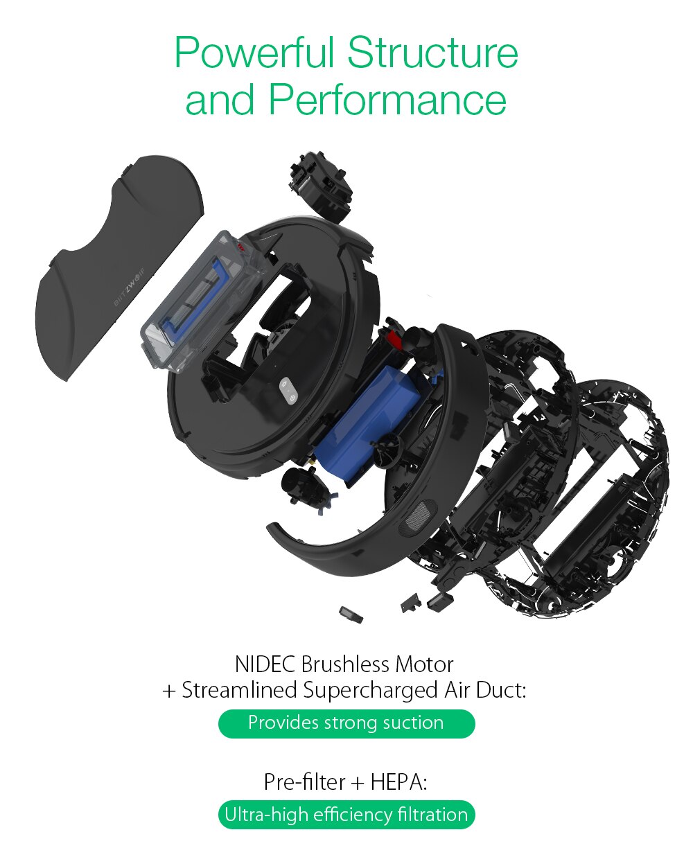 Hầu hết phần vỏ robot được làm từ nhựa ABS. Đây là loại nhựa cao cấp, có độ bền, cứng cao, trọng lượng nhẹ, rất phù hợp với các thiết bị công nghệ thông minh như robot hút bụi.