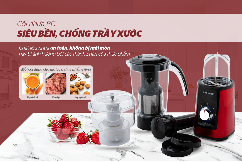 Bộ sản phẩm SUNHOUSE MAMA SHD5353W được trang bị cối nhựa PC cao cấp có độ cứng cao với khả năng chống va đập cực tốt.