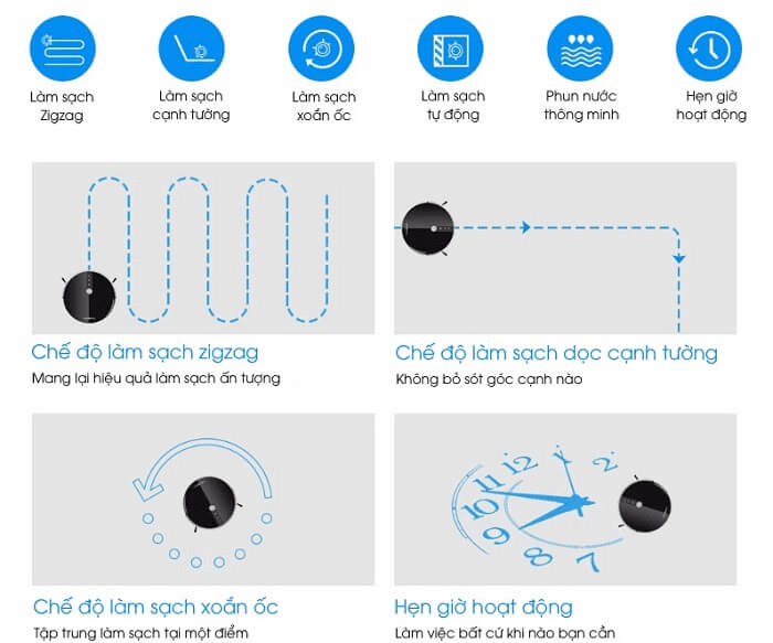 | Chế độ làm sạch | Tự động/Tập trung điểm/Mép tường/Hẹn giờ/Từng phòng |