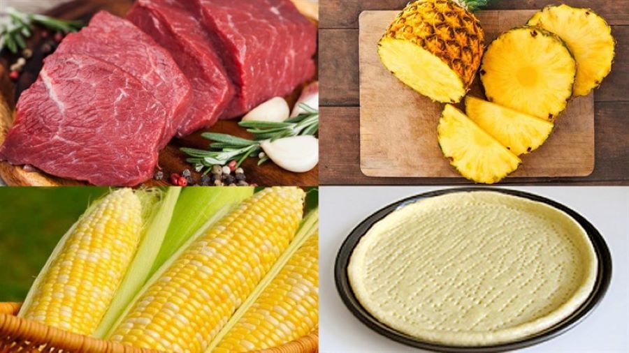 Bước thứ nhất, chúng ta cần sơ chế các nguyên liệu mà chúng ta đã chuẩn bị. Thịt bò: rửa sạch, để ráo và băm nhuyễn. Bắp ngọt: bóc vỏ, bỏ râu, tách hạt (có thể dùng dao để tách dọc). Tỏi: băm nhuyễn. Hành tây: chia làm 2 phần, một thái sợi vừa ăn, hai băm nhuyễn. Ớt chuông: cắt thành sợi. Dứa: gọt vỏ, bỏ phần mắt, cắt thành miếng.