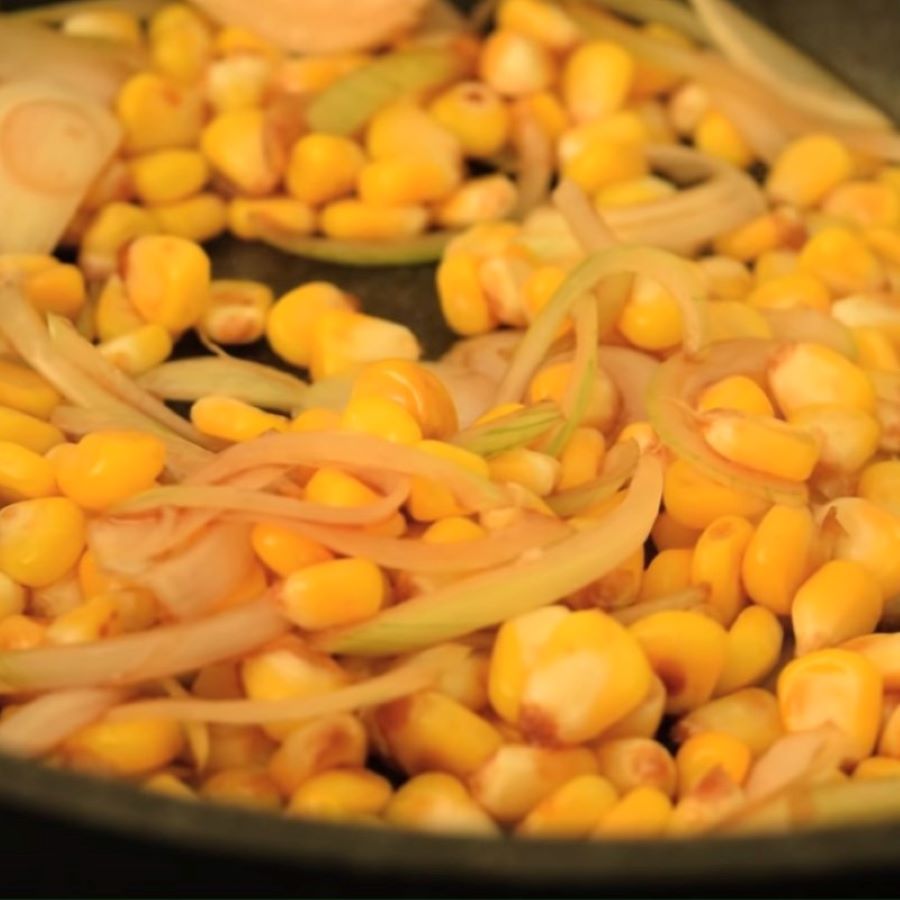 Đầu tiên là sơ chế nguyên liệu: rửa sạch từng nguyên liệu, băm nhuyễn tỏi rồi phi thơm với dầu, sau đó cho ngô vào xào sơ qua với muối, đường, tiêu đã chuẩn bị.