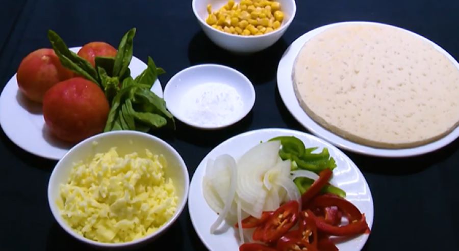 Phết một lớp mỏng dầu oliu lên đế bánh rồi dưới đều nước sốt vừa làm lên. Phủ đều lên mặt bánh lần lượt bằng bắp ngọt, hành tây, ớt và cuối cùng là lớp phô mai dày.