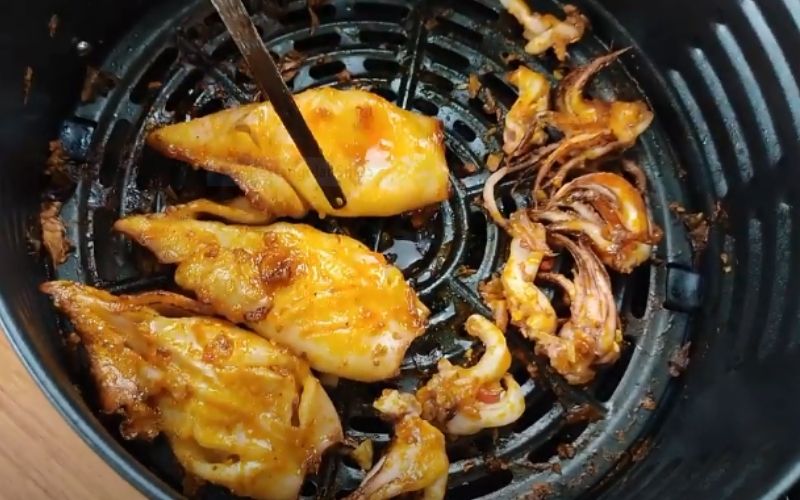 Cho mực vào nồi chiên không dầu, nướng ở mức nhiệt 180 độ trong vòng 10 phút. Sau đó, lật mặt mực lại và nướng tiếp với 200 độ trong 5 phút là hoàn thành.